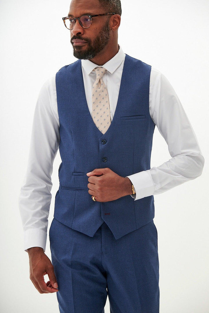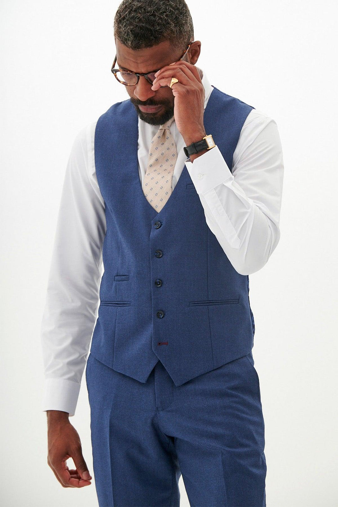 Elevate your wardrobe with this men's blue waistcoat, a timeless piece designed for refined elegance. Crafted with a luxurious silk-style lining, it ensures a smooth, comfortable fit enhanced by added elastane for gentle stretch. This waistcoat effortlessly combines classic tailoring with modern comfort, making it ideal for both formal occasions and stylish everyday wear. As a distinguished touch, it includes a complimentary matching pocket square, completing your ensemble with subtle sophistication. Perfect for those who appreciate attention to detail and lasting style, the Ashley waistcoat redefines smart dressing with ease and grace.