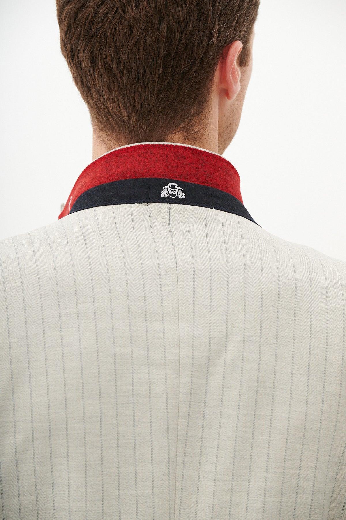 The rear view showcases a person in Marc Darcys GRANT - Stone Pinstripe Blazer with a red collar featuring dark lining and a small white embroidery. The classic formalwear style is complemented by their short brown hair as they face away from the camera.