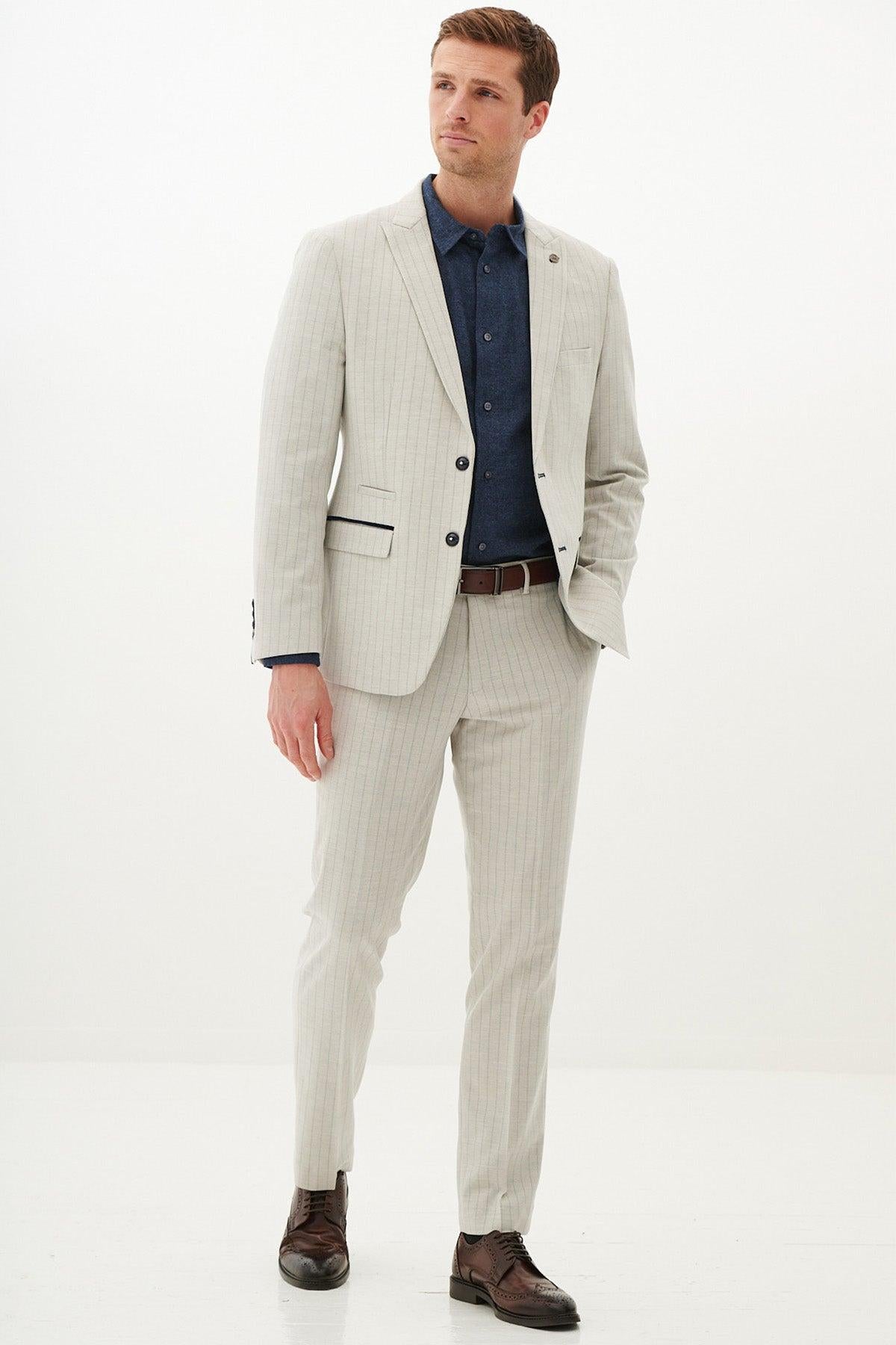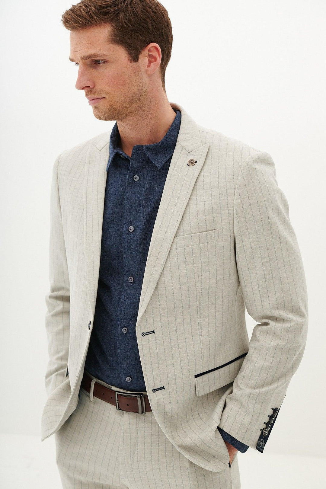 A person wearing the Marc Darcy GRANT - Stone Pinstripe Blazer and a blue shirt stands against a plain white background. They look to the side with one hand in their pocket, wearing brown shoes, exemplifying sophisticated formalwear.