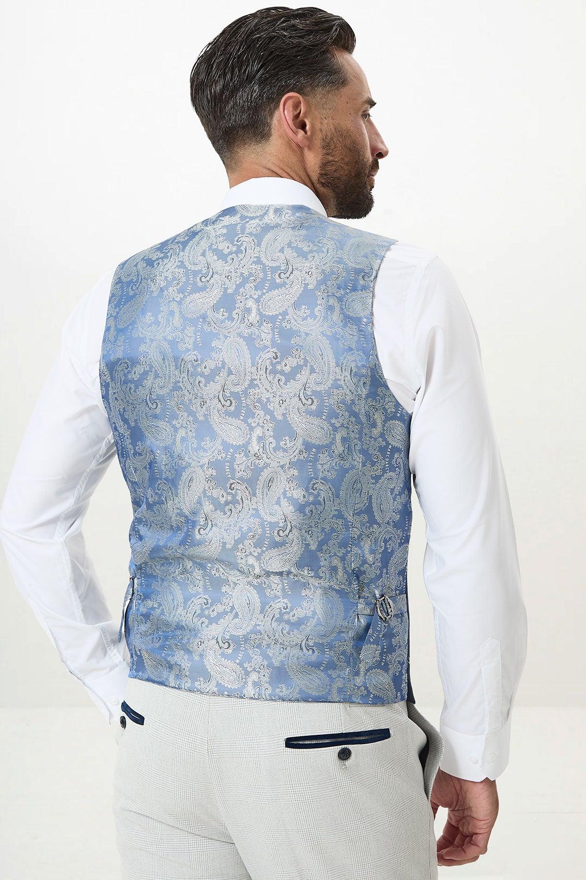 A man facing away wears the Marc Darcy BROMLEY Stone Check Suit pants with dark-trimmed back pockets, paired with a Kelvin Navy Waistcoat over a white shirt. The background is plain white.