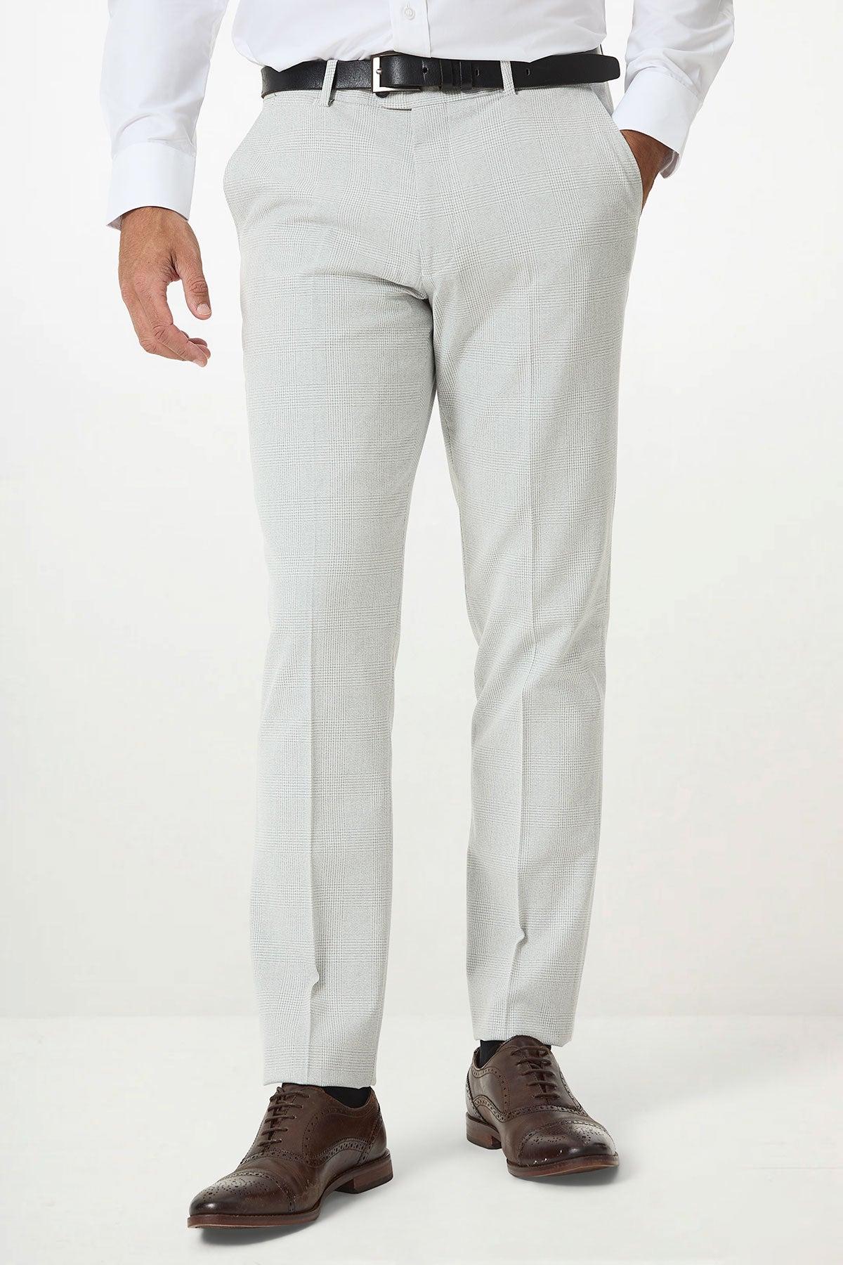 A man wearing Marc Darcys BROMLEY Stone Check Suit pants and a white shirt stands facing away; the light gray checked trousers feature black trim on the back pockets.