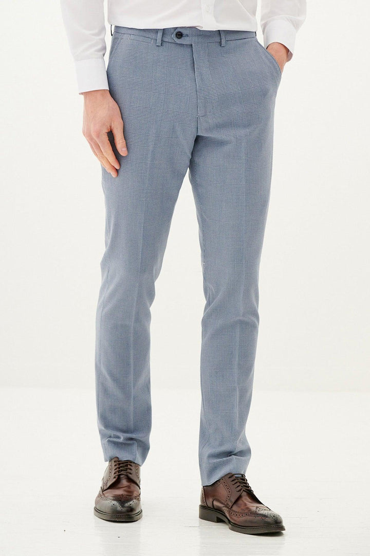 Someone is wearing a white shirt with slim fit Marc Darcy BROMLEY Sky Blue Check Trousers, which feature a buttoned back pocket.