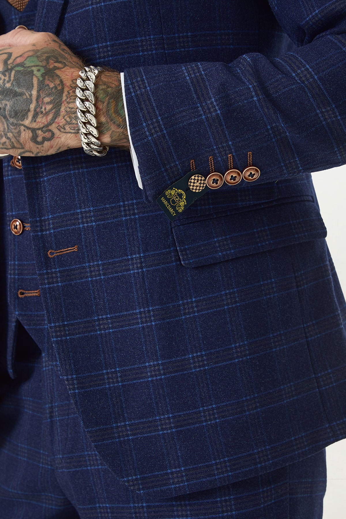 A person wearing the marcdarcy CHIGWELL Blue Tweed Check Three Piece Suit with brown buttons, a tattooed hand, thick silver bracelet, and a slim fit sleeve featuring a visible yellow label and brown buttonhole stitching.