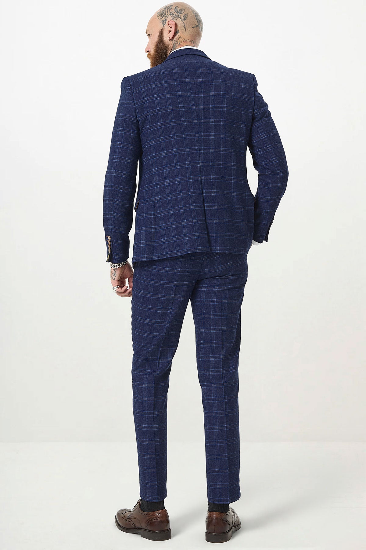 A man with tattoos and a beard wears the marcdarcy CHIGWELL Blue Tweed Check Three Piece Suit and brown shoes, standing with his back to the camera against a plain white background.