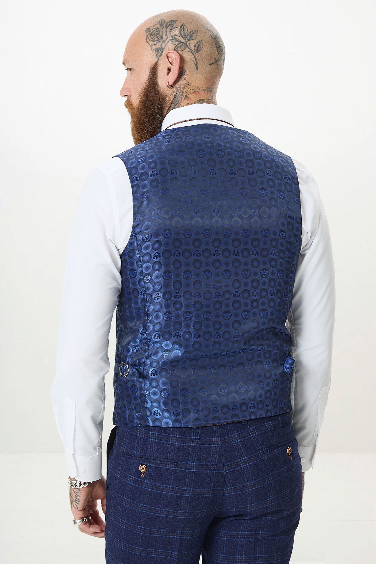 A man with a beard and head tattoos is shown from behind, wearing a white shirt, blue plaid trousers, and the marcdarcy CHIGWELL Blue Tweed Check Waistcoat. The background is plain and light-colored.