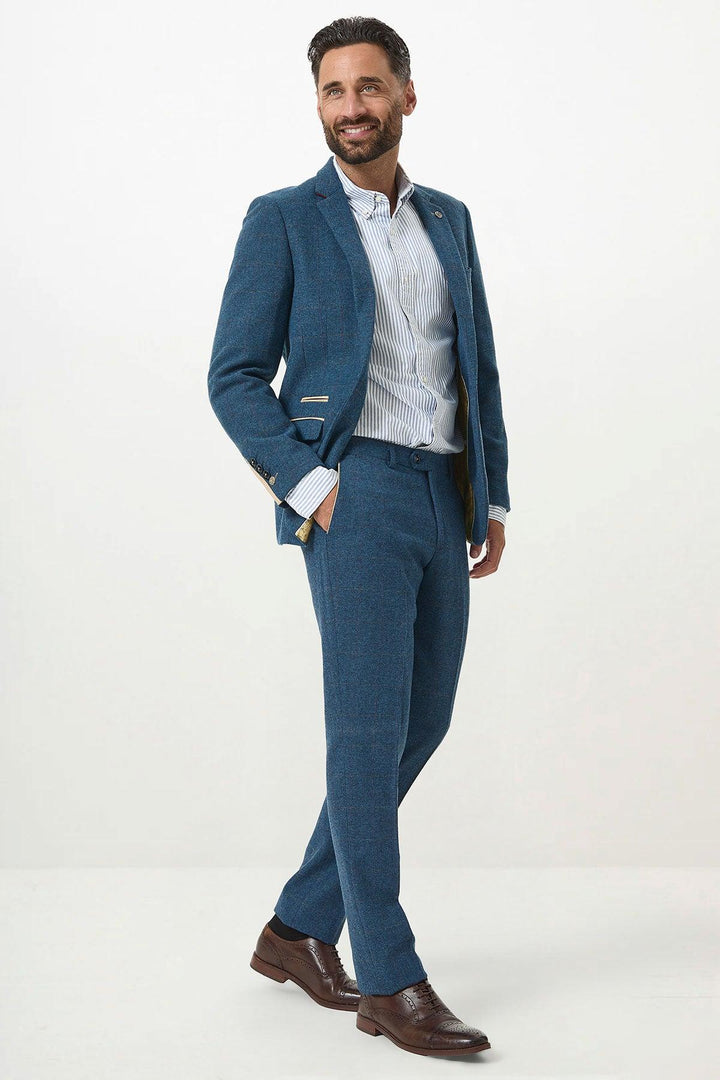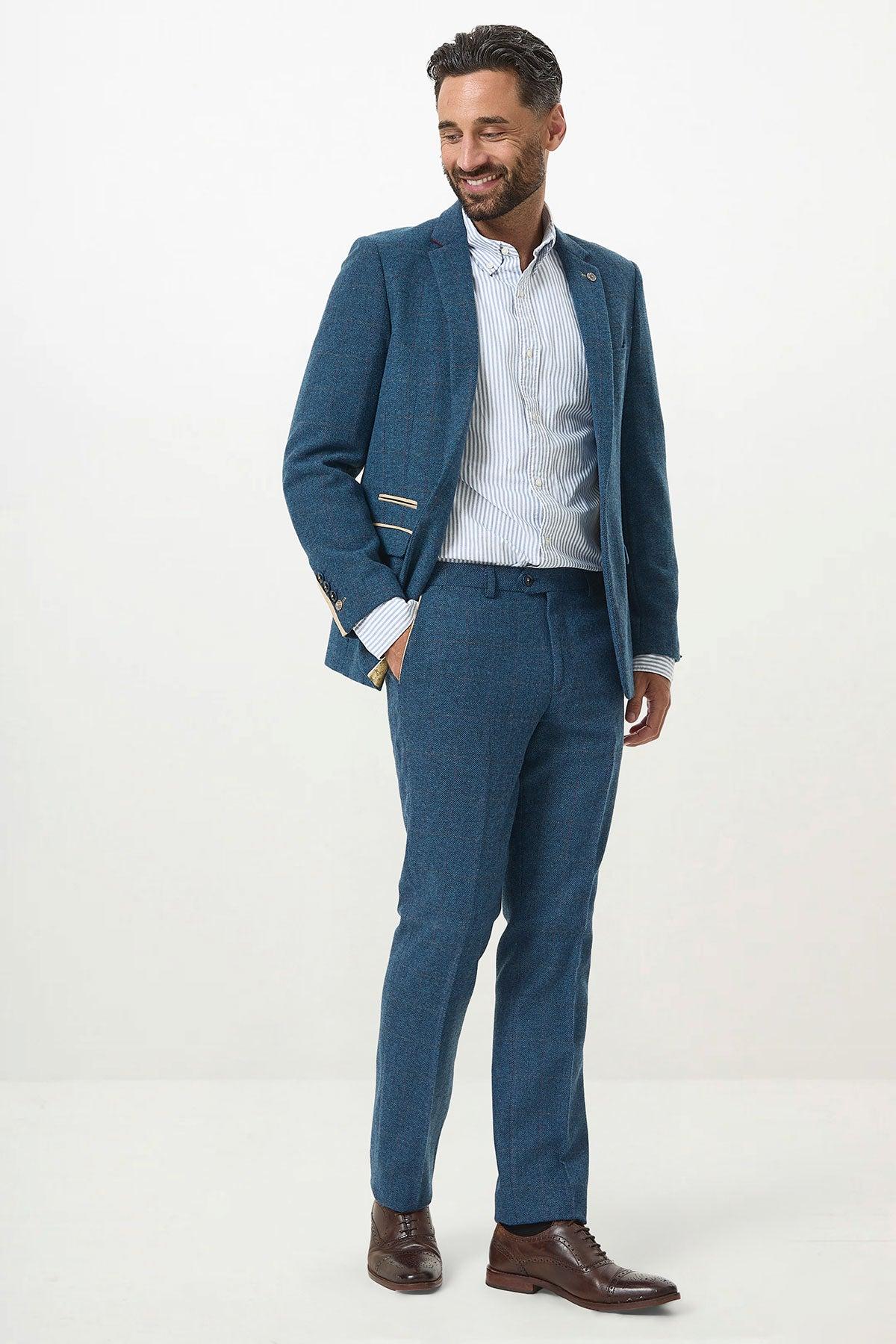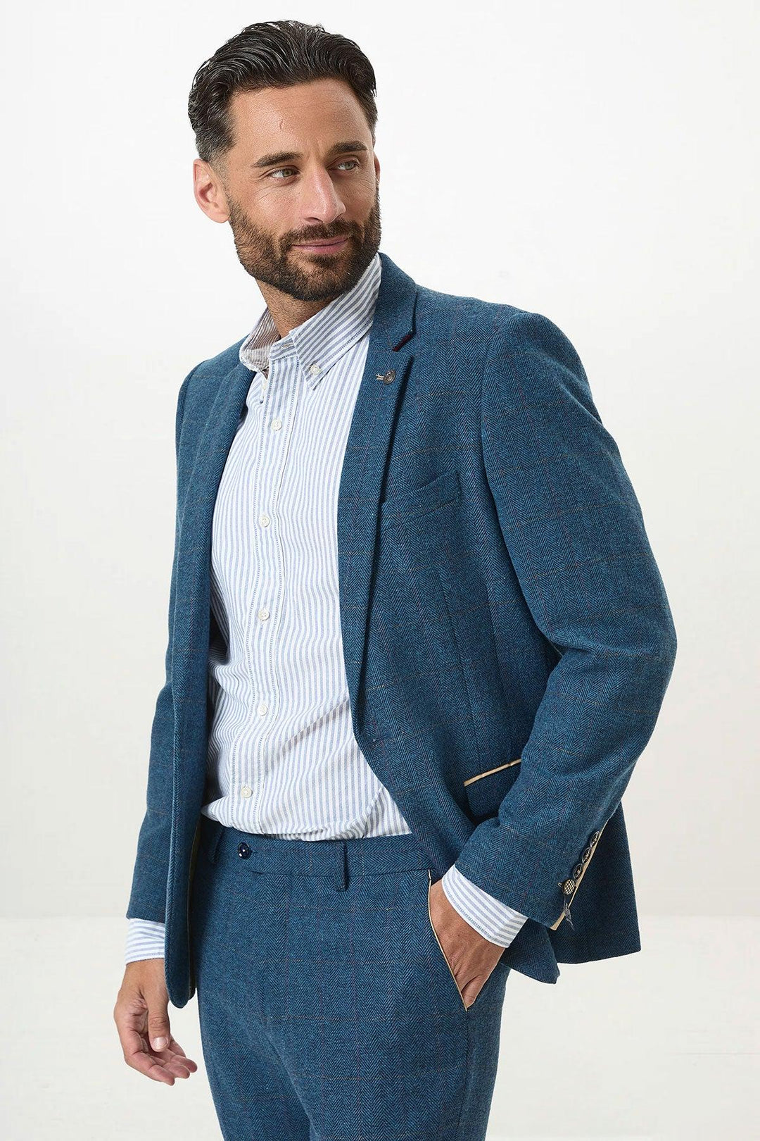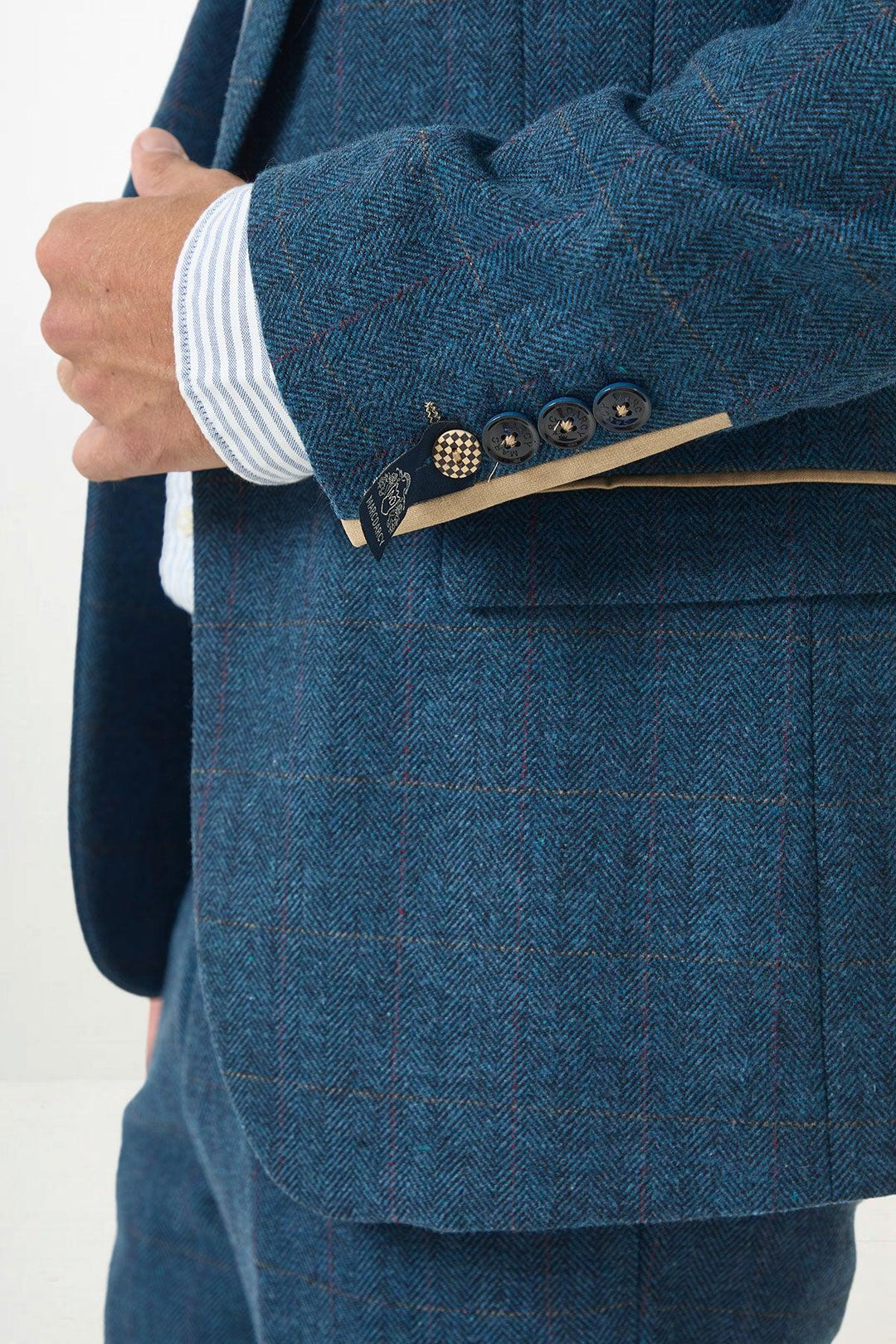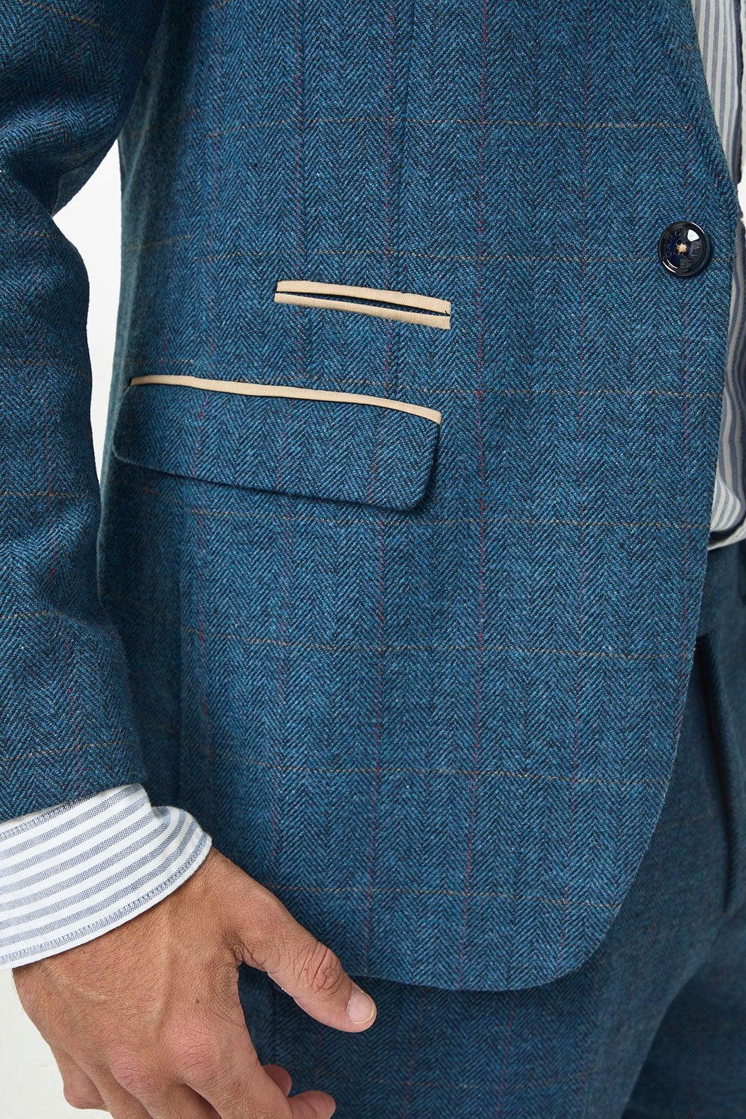 A close-up of a person wearing the Marc Darcy DION Blue Tweed Check Two Piece Suit with beige pocket trim, a striped shirt cuff visible at the wrist, and matching blue trousers.