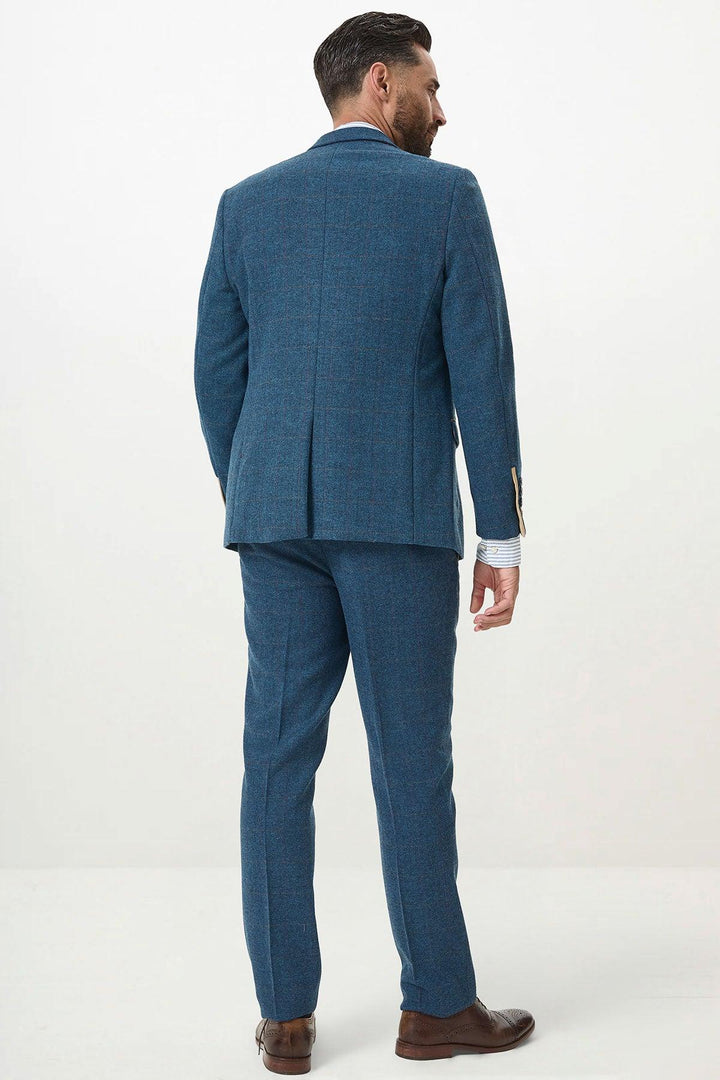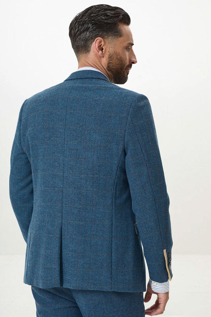 A man with short dark hair and a beard is seen from behind, wearing the Marc Darcy DION Blue Tweed Check Two Piece Suit. The slim fit suit features a subtle plaid pattern and is set against a plain, light background.