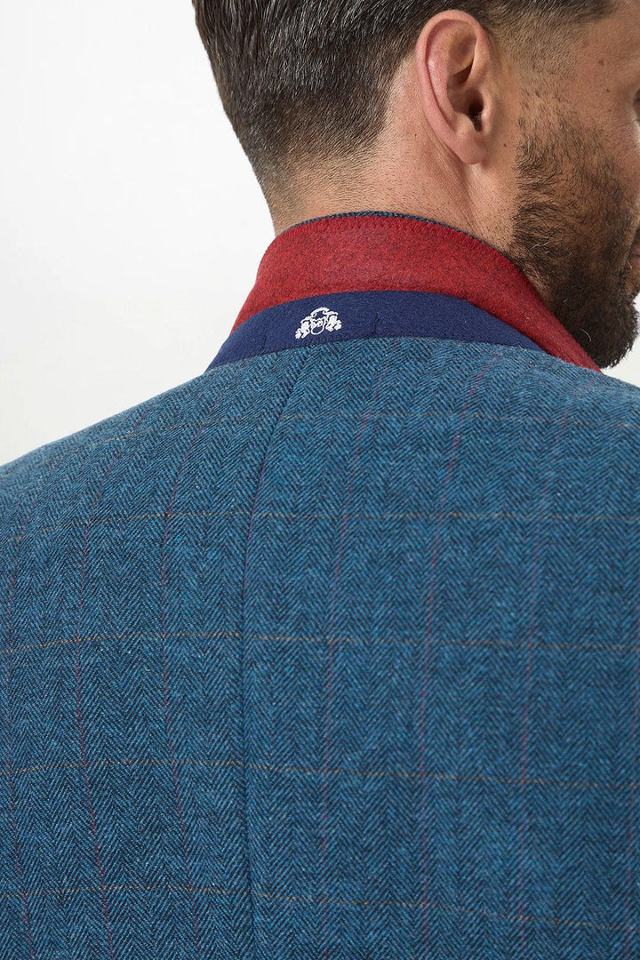 Close-up of a mans back in the Marc Darcy DION Blue Tweed Check Two Piece Suit, featuring a red and navy collar with a small white embroidered detail; his face is partially out of frame.