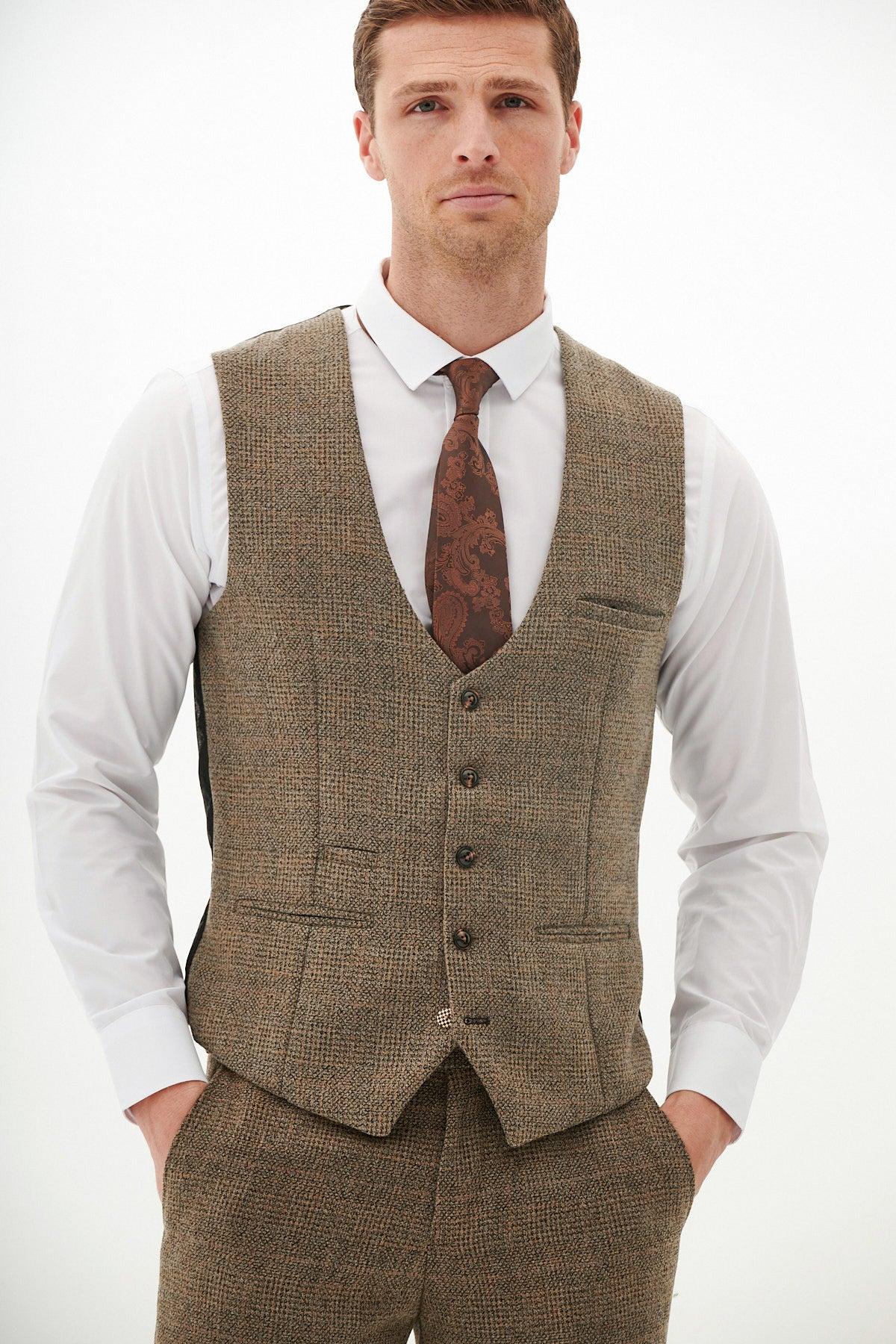 A man in a suit, styled with the Marc Darcy KRIS Tan Tweed Waistcoat, exudes timeless sophistication reminiscent of classic tailoring.
