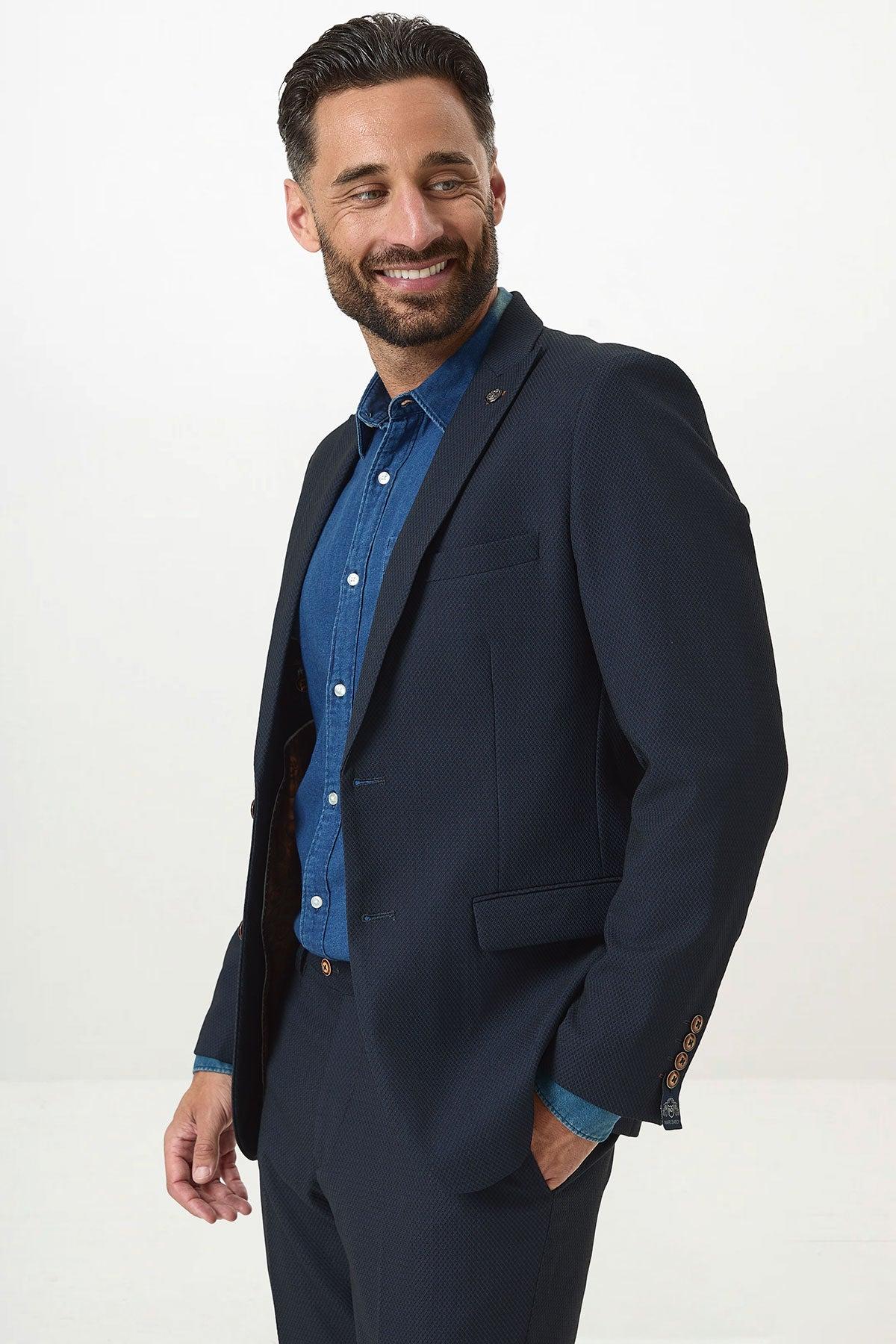 Not sure what to wear to that birthday BBQ? This Max two piece will tick the box. So versatile that it looks great with a casual tee and trainers dressed down, yet can also be stored away for more formal events paired with a shirt and tie. Featuring contrast buttons to the blazer and trousers and all cut to a contemporary slim fit.